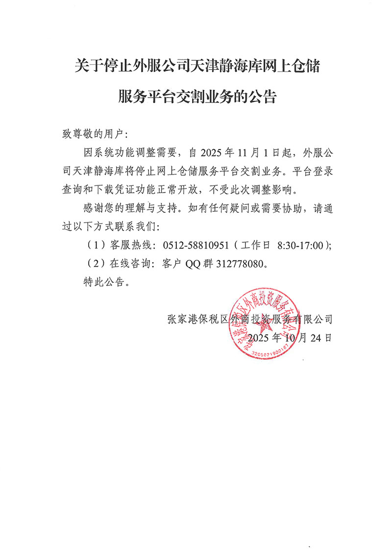 关于停止外服公司天津静海库网上仓储服务平台交割业务的公告