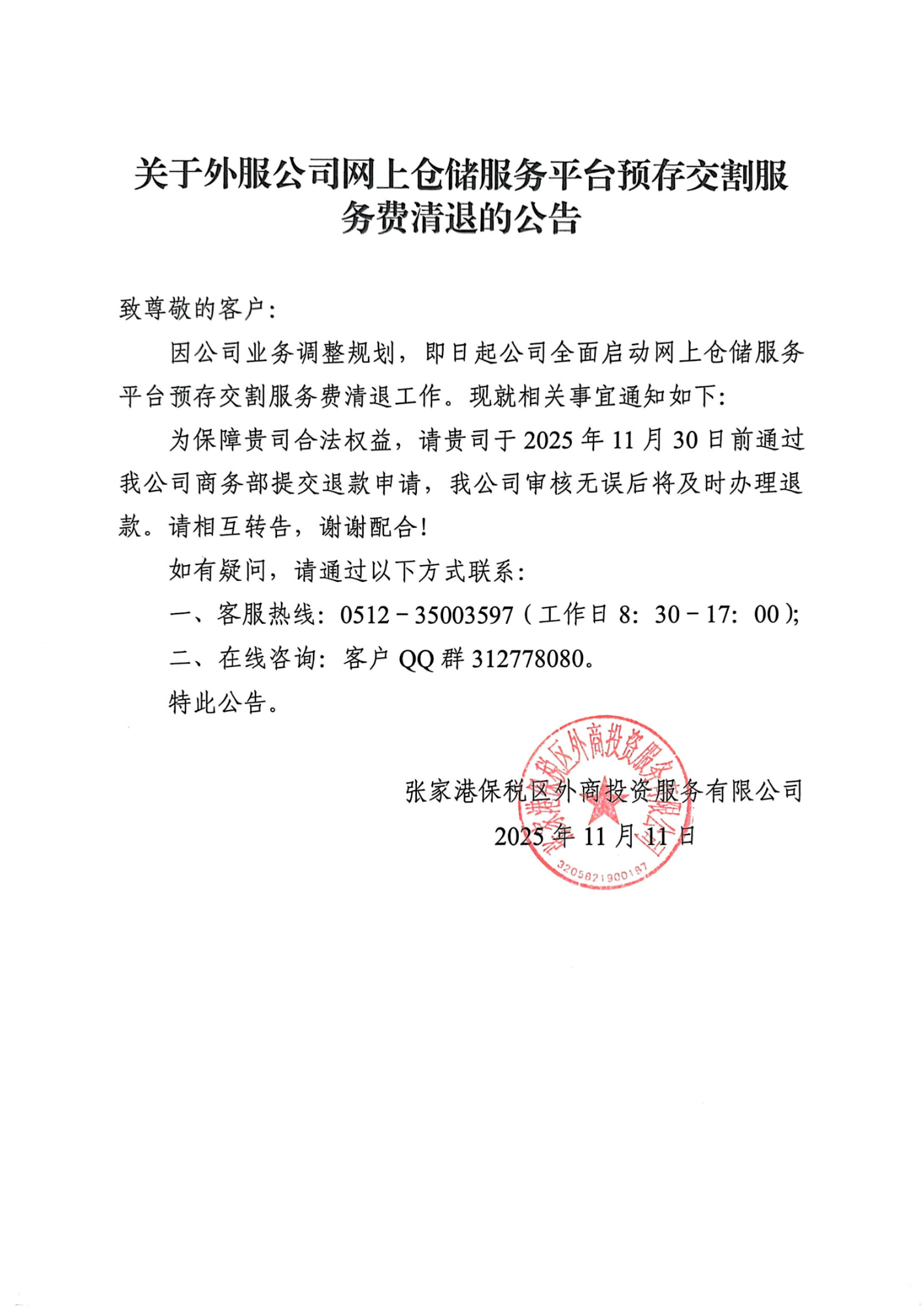 关于外服公司网上仓储服务平台预存交割服务费清退的公告